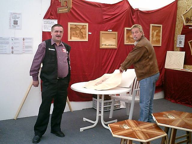 ... Letzte Vorbereitungen am Stand vom Intarsienschreiner Thomas Märki ...